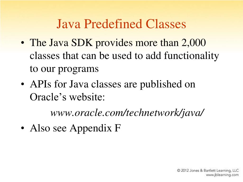 Java Predefined Classes • The Java SDK provides more than 2,000 classes that can be used to add functionality to our programs • APIs for Java classes are published on Oracle’s website: www.oracle.com/technetwork/java/ • Also see Appendix F