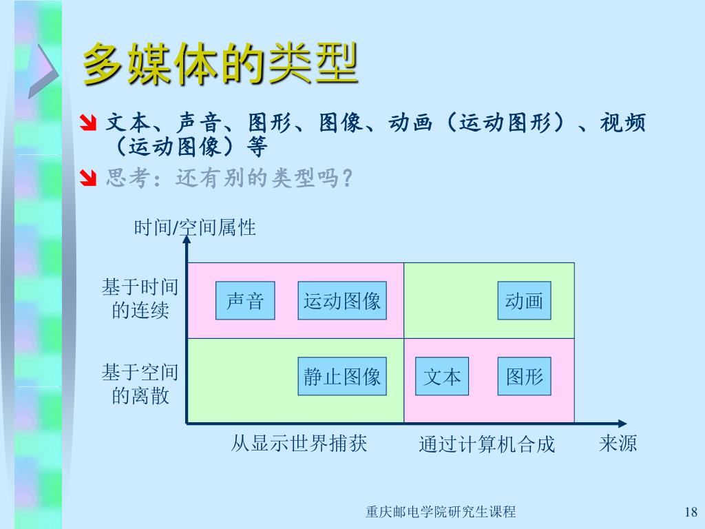 时间/空间属性 基于时间 的连续 声音 运动图像 动画 基于空间 的离散 静止图像 文本 图形 来源 从显示世界捕获 通过计算机合成 多媒体的类型 • 文本、声音、图形、图像、动画(运动图形)、视频(运动图像)等 • 思考:还有别的类型吗? 重庆邮电学院研究生课程