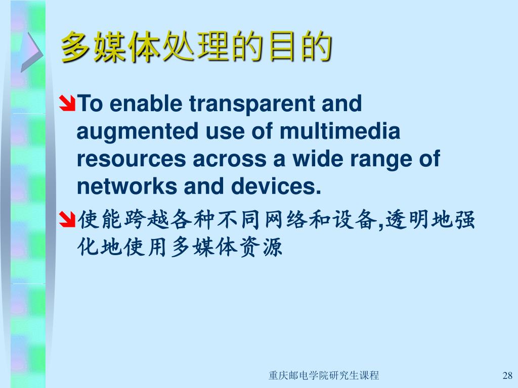多媒体处理的目的 • To enable transparent and augmented use of multimedia resources across a wide range of networks and devices. • 使能跨越各种不同网络和设备,透明地强化地使用多媒体资源 重庆邮电学院研究生课程
