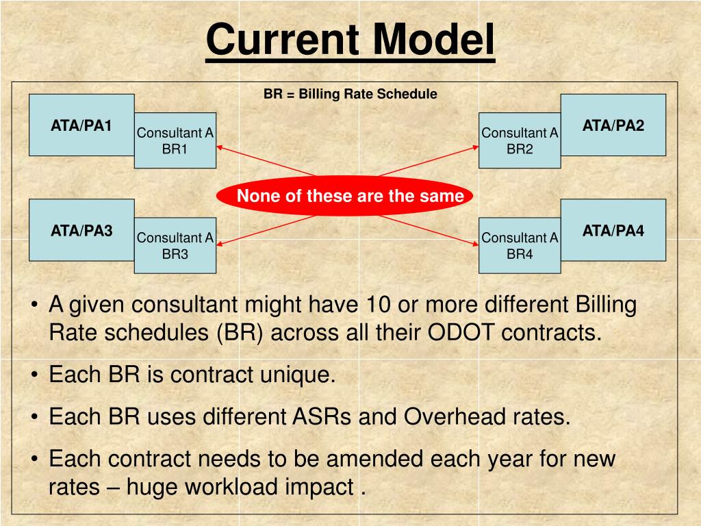 Current Model BR = Billing Rate Schedule ATA/PA1 ATA/PA2 Consultant A BR1 Consultant A BR2 None of these are the same ATA/PA3 ATA/PA4 Consultant A BR3 Consultant A BR4 • A given consultant might have 10 or more different Billing Rate schedules (BR) across all their ODOT contracts. • Each BR is contract unique. • Each BR uses different ASRs and Overhead rates. • Each contract needs to be amended each year for new rates – huge workload impact .