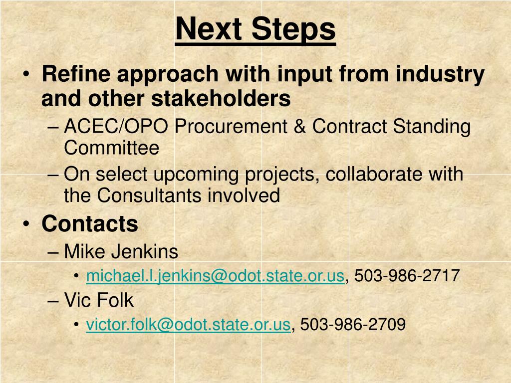 Next Steps • Refine approach with input from industry and other stakeholders • ACEC/OPO Procurement & Contract Standing Committee • On select upcoming projects, collaborate with the Consultants involved • Contacts • Mike Jenkins • michael.l.jenkins@odot.state.or.us, 503-986-2717 • Vic Folk • victor.folk@odot.state.or.us, 503-986-2709