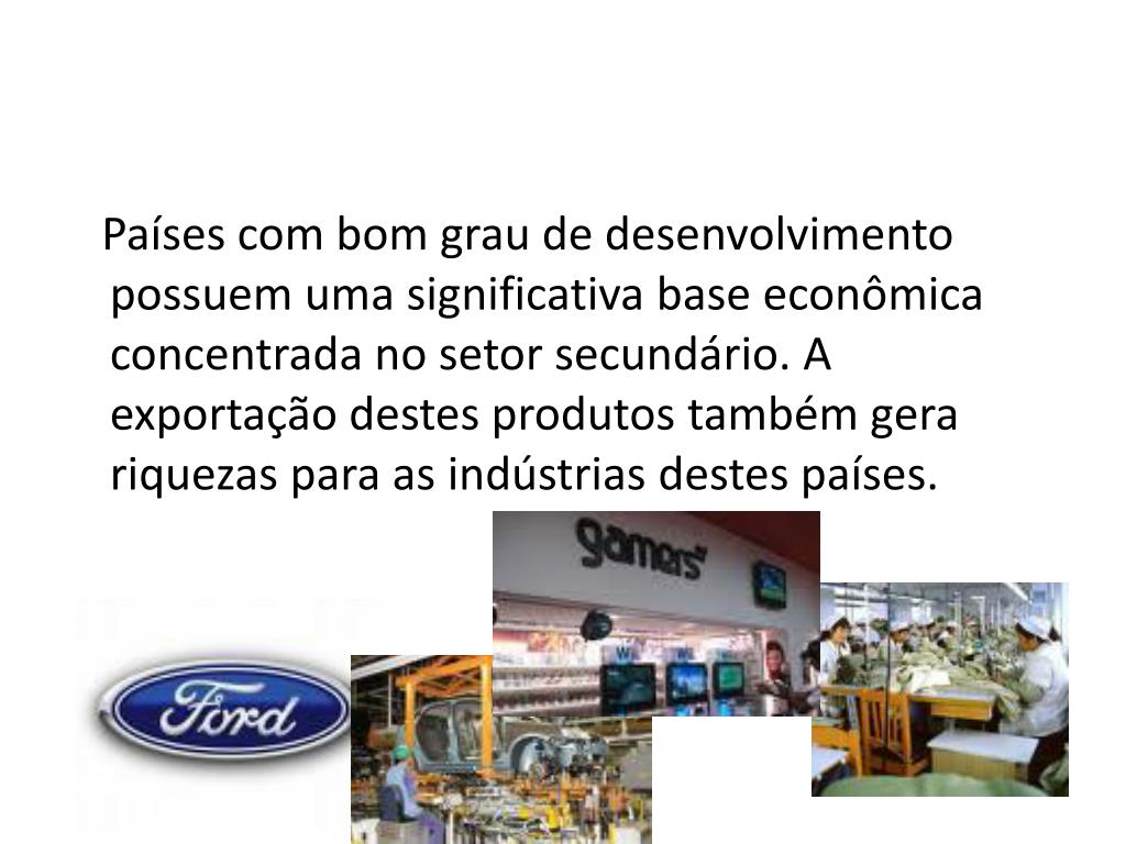 Países com bom grau de desenvolvimento possuem uma significativa base econômica concentrada no setor secundário. A exportação destes produtos também gera riquezas para as indústrias destes países.