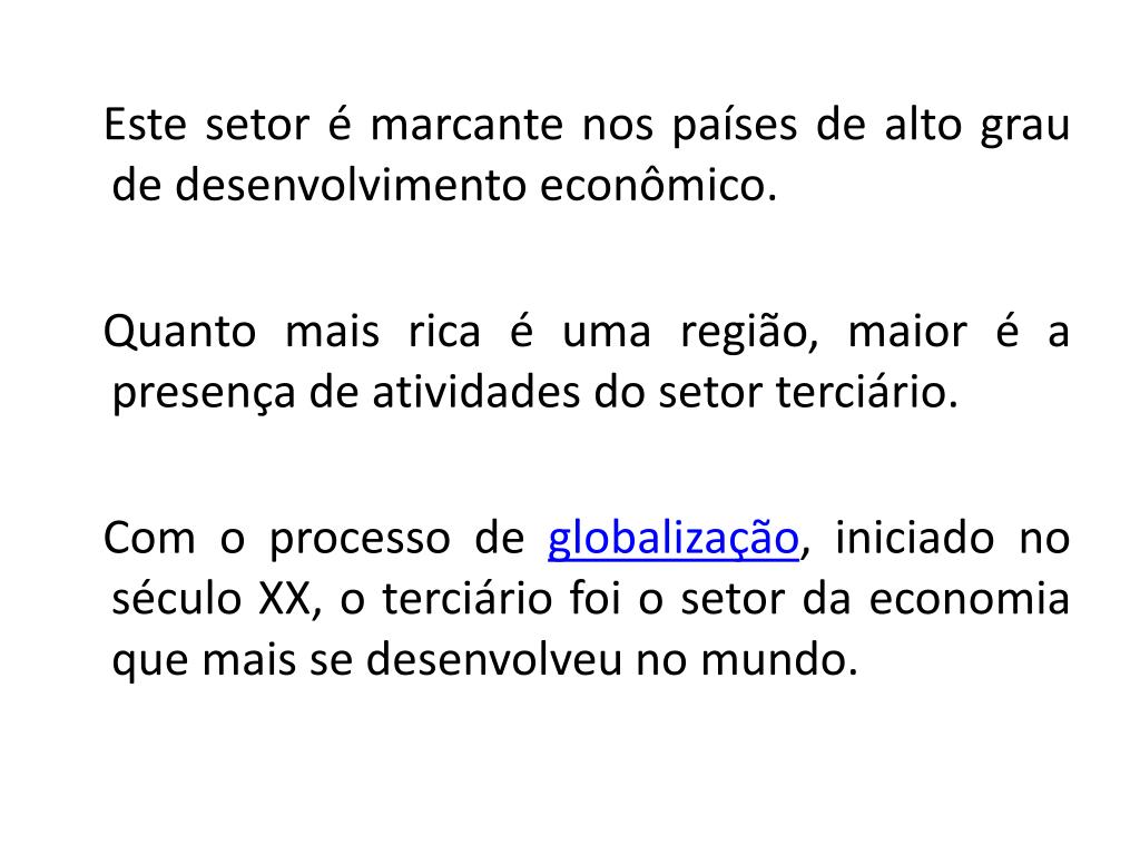 Este setor é marcante nos países de alto grau de desenvolvimento econômico. Quanto mais rica é uma região, maior é a presença de atividades do setor terciário. Com o processo de globalização, iniciado no século XX, o terciário foi o setor da economia que mais se desenvolveu no mundo.