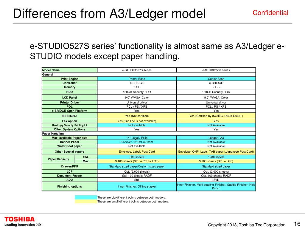 Differences from A3/Ledger model e-STUDIO527S series’ functionality is almost same as A3/Ledger e-STUDIO models except paper handling.