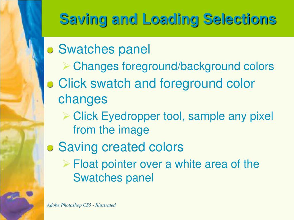Saving and Loading Selections • Swatches panel • Changes foreground/background colors • Click swatch and foreground color changes • Click Eyedropper tool, sample any pixel from the image • Saving created colors • Float pointer over a white area of the Swatches panel Adobe Photoshop CS5 - Illustrated