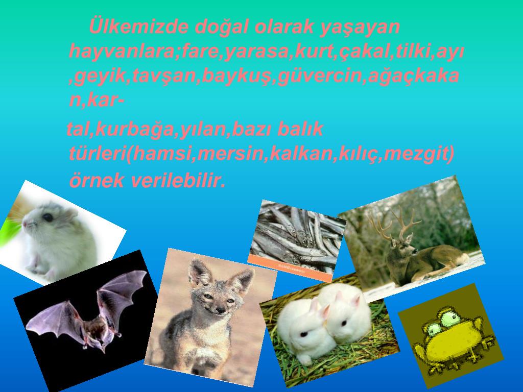 Ülkemizde doğal olarak yaşayan hayvanlara;fare,yarasa,kurt,çakal,tilki,ayı,geyik,tavşan,baykuş,güvercin,ağaçkakan,kar- tal,kurbağa,yılan,bazı balık türleri(hamsi,mersin,kalkan,kılıç,mezgit)örnek verilebilir.