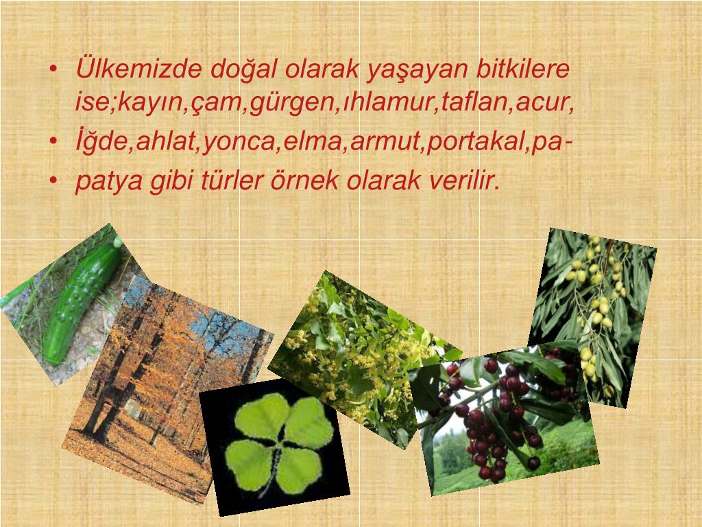 Ülkemizde doğal olarak yaşayan bitkilere ise;kayın,çam,gürgen,ıhlamur,taflan,acur, • İğde,ahlat,yonca,elma,armut,portakal,pa- • patya gibi türler örnek olarak verilir.