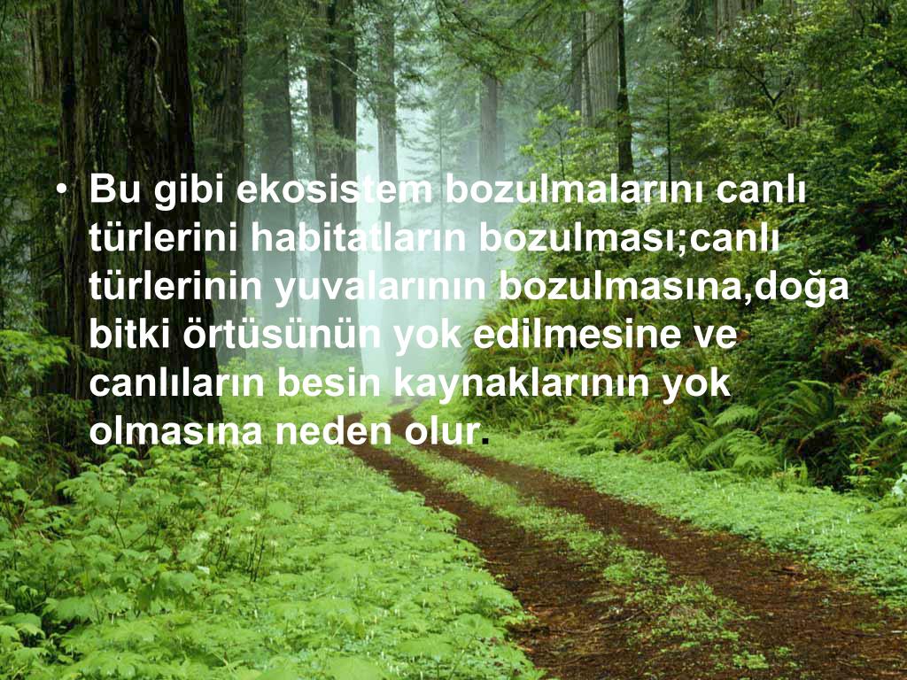 Bu gibi ekosistem bozulmalarını canlı türlerini habitatların bozulması;canlı türlerinin yuvalarının bozulmasına,doğa bitki örtüsünün yok edilmesine ve canlıların besin kaynaklarının yok olmasına neden olur.