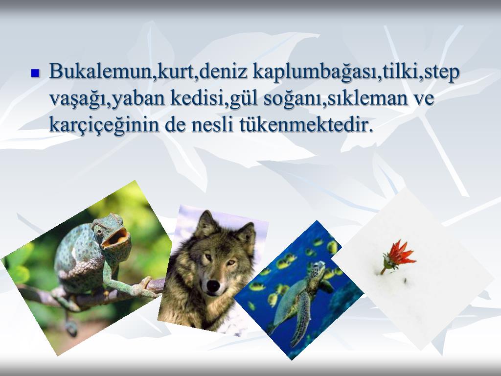 Bukalemun,kurt,deniz kaplumbağası,tilki,step vaşağı,yaban kedisi,gül soğanı,sıkleman ve karçiçeğinin de nesli tükenmektedir.