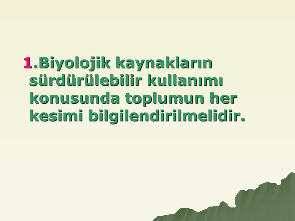 1.Biyolojik kaynakların sürdürülebilir kullanımı konusunda toplumun her kesimi bilgilendirilmelidir.