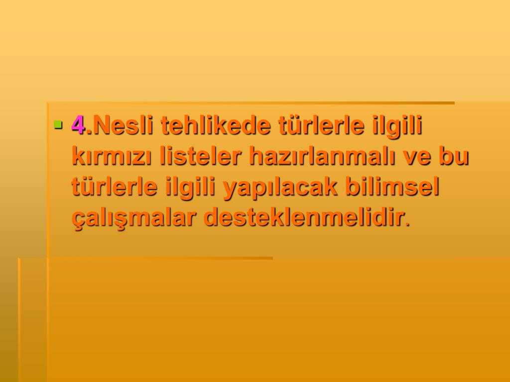 4.Nesli tehlikede türlerle ilgili kırmızı listeler hazırlanmalı ve bu türlerle ilgili yapılacak bilimsel çalışmalar desteklenmelidir.