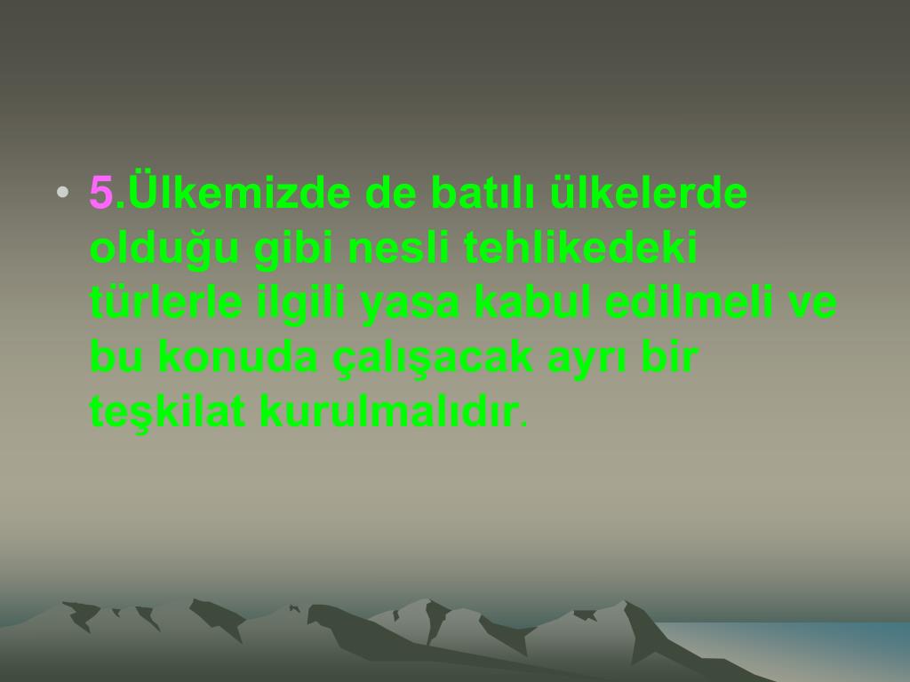 5.Ülkemizde de batılı ülkelerde olduğu gibi nesli tehlikedeki türlerle ilgili yasa kabul edilmeli ve bu konuda çalışacak ayrı bir teşkilat kurulmalıdır.