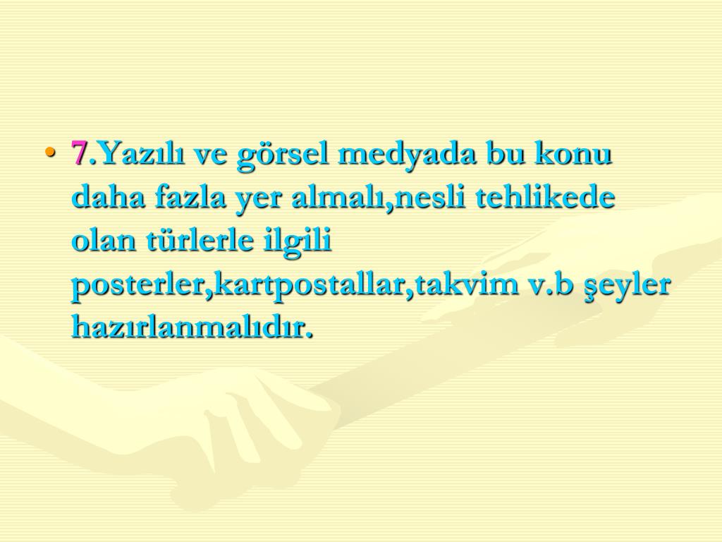 7.Yazılı ve görsel medyada bu konu daha fazla yer almalı,nesli tehlikede olan türlerle ilgili posterler,kartpostallar,takvim v.b şeyler hazırlanmalıdır.