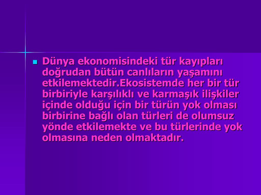 Dünya ekonomisindeki tür kayıpları doğrudan bütün canlıların yaşamını etkilemektedir.Ekosistemde her bir tür birbiriyle karşılıklı ve karmaşık ilişkiler içinde olduğu için bir türün yok olması birbirine bağlı olan türleri de olumsuz yönde etkilemekte ve bu türlerinde yok olmasına neden olmaktadır.