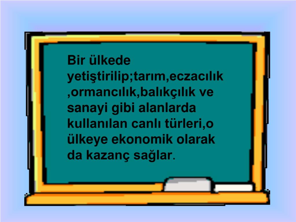 Bir ülkede yetiştirilip;tarım,eczacılık,ormancılık,balıkçılık ve sanayi gibi alanlarda kullanılan canlı türleri,o ülkeye ekonomik olarak da kazanç sağlar.