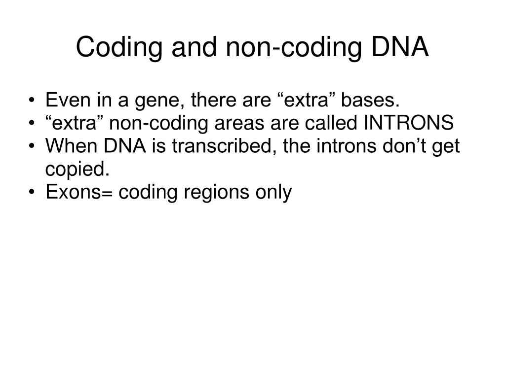 Coding and non-coding DNA Even in a gene, there are “extra” bases. “extra” non-coding areas are called INTRONS When DNA is transcribed, the introns don’t get copied. Exons= coding regions only