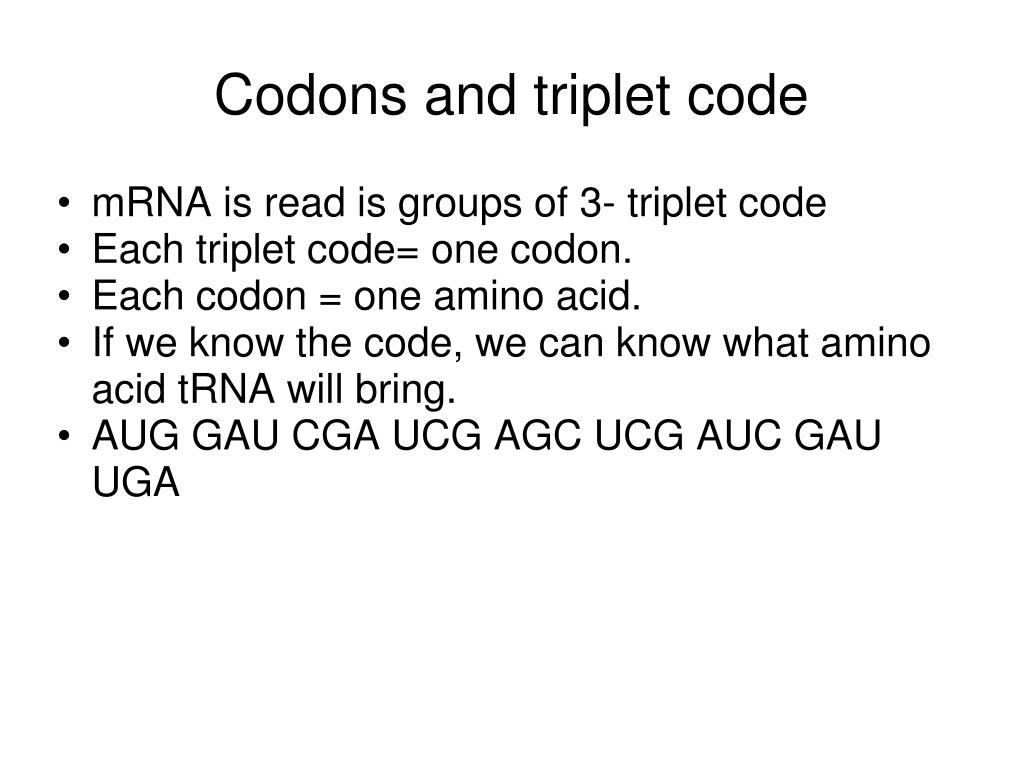 Codons and triplet code mRNA is read is groups of 3- triplet code Each triplet code= one codon. Each codon = one amino acid. If we know the code, we can know what amino acid tRNA will bring. AUG GAU CGA UCG AGC UCG AUC GAU UGA