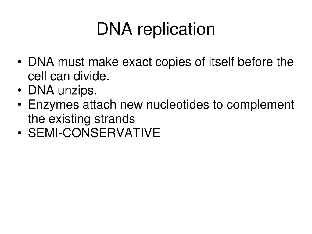 DNA replication DNA must make exact copies of itself before the cell can divide. DNA unzips. Enzymes attach new nucleotides to complement the existing strands SEMI-CONSERVATIVE