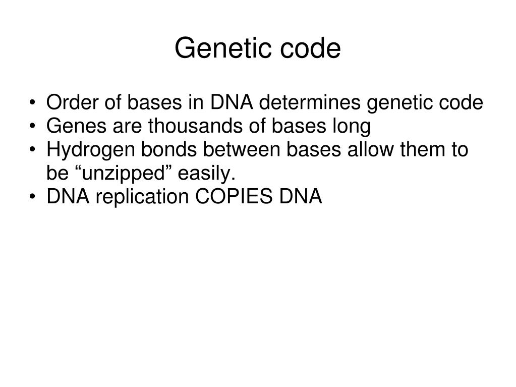 Genetic code Order of bases in DNA determines genetic code Genes are thousands of bases long Hydrogen bonds between bases allow them to be “unzipped” easily. DNA replication COPIES DNA