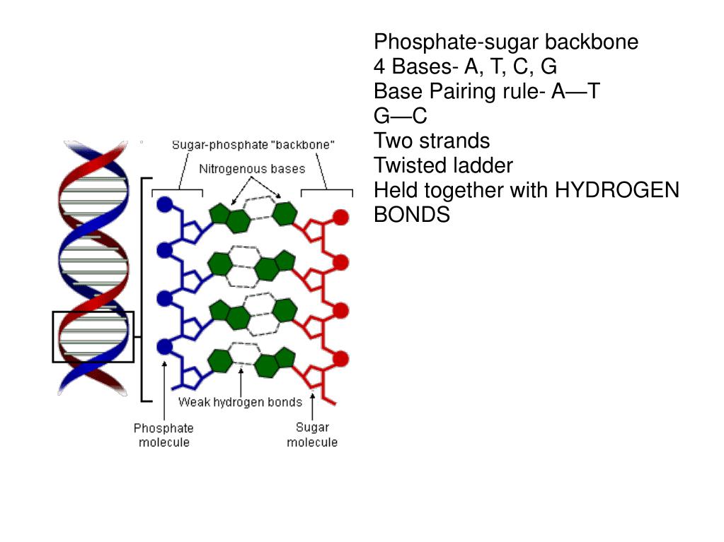 Phosphate-sugar backbone 4 Bases- A, T, C, G Base Pairing rule- A—T G—C Two strands Twisted ladder Held together with HYDROGEN BONDS
