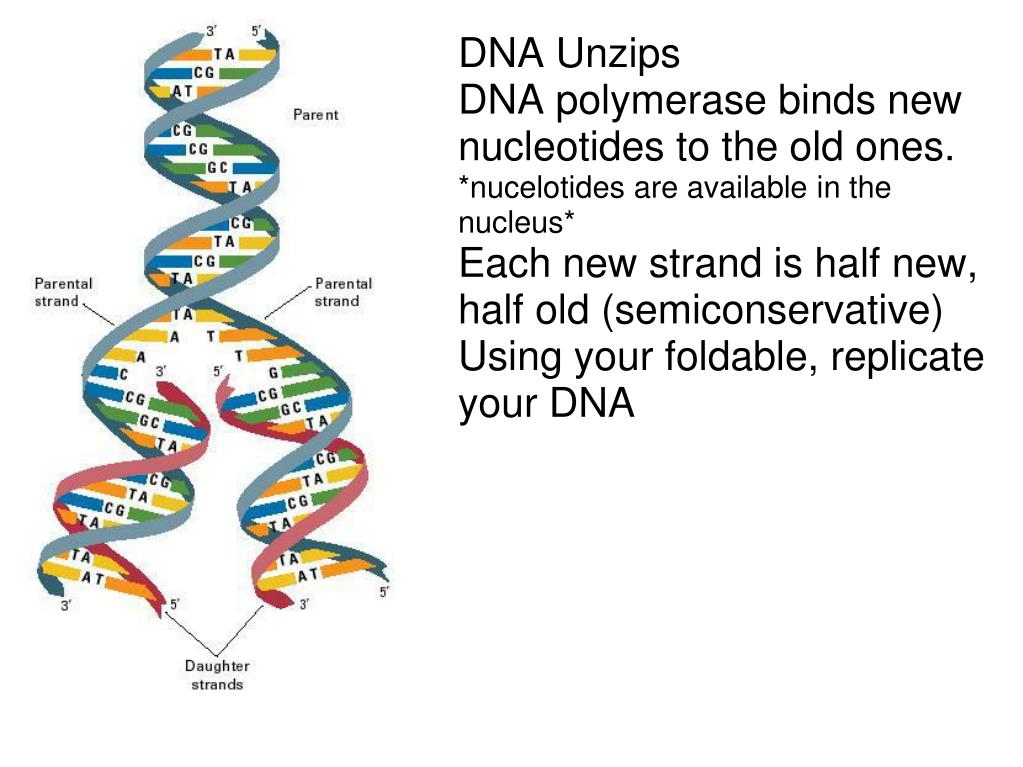 DNA Unzips DNA polymerase binds new nucleotides to the old ones. *nucelotides are available in the nucleus* Each new strand is half new, half old (semiconservative) Using your foldable, replicate your DNA