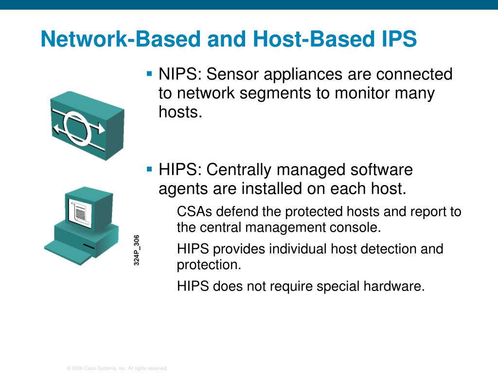 Network-Based and Host-Based IPS • NIPS: Sensor appliances are connected to network segments to monitor many hosts. • HIPS: Centrally managed software agents are installed on each host. • CSAs defend the protected hosts and report to the central management console. • HIPS provides individual host detection and protection. • HIPS does not require special hardware.