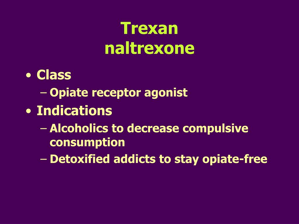 Trexannaltrexone • Class • Opiate receptor agonist • Indications • Alcoholics to decrease compulsive consumption • Detoxified addicts to stay opiate-free