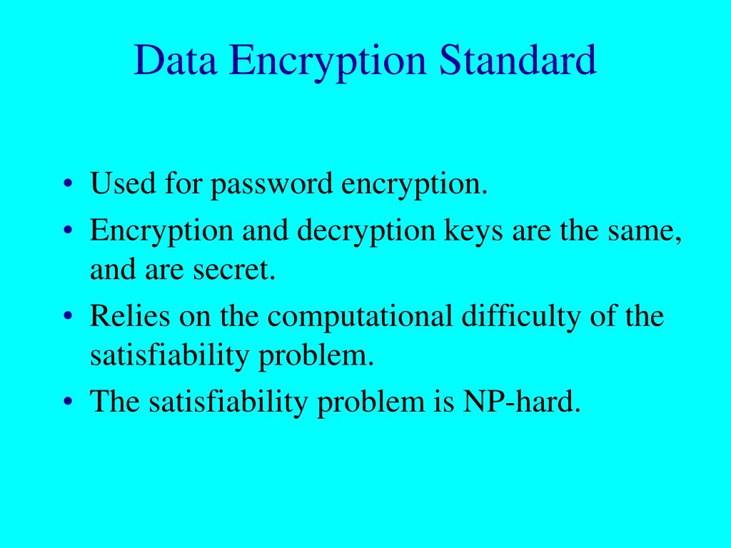 Data Encryption Standard • Used for password encryption. • Encryption and decryption keys are the same, and are secret. • Relies on the computational difficulty of the satisfiability problem. • The satisfiability problem is NP-hard.