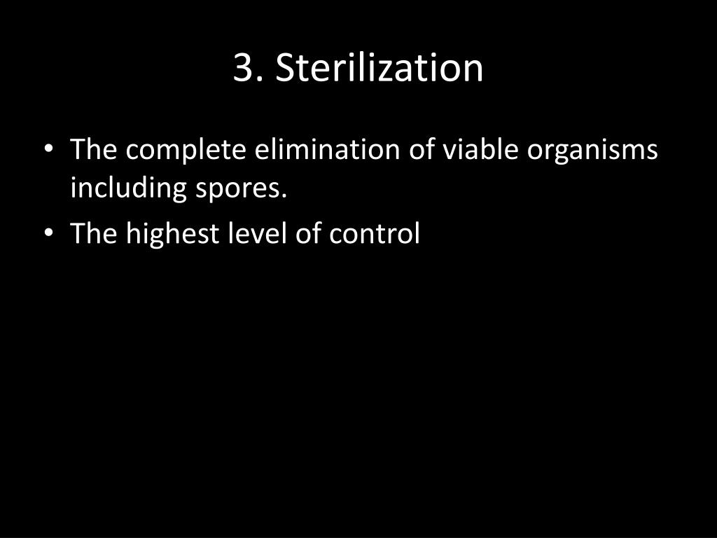 3. Sterilization • The complete elimination of viable organisms including spores. • The highest level of control