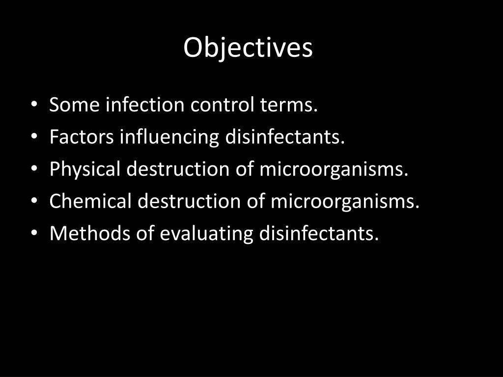 Objectives • Some infection control terms. • Factors influencing disinfectants. • Physical destruction of microorganisms. • Chemical destruction of microorganisms. • Methods of evaluating disinfectants.