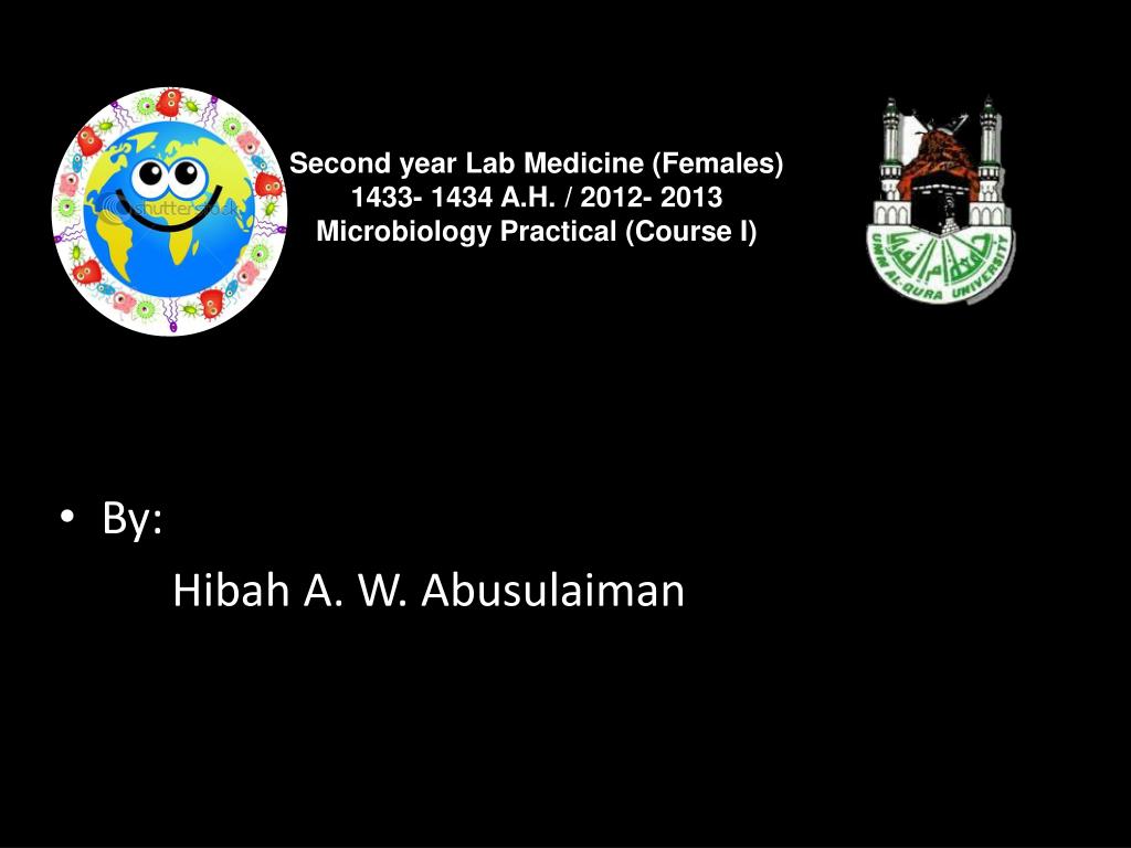 Second year Lab Medicine (Females) 1433- 1434 A.H. / 2012- 2013 Microbiology Practical (Course I) • By: Hibah A. W. Abusulaiman
