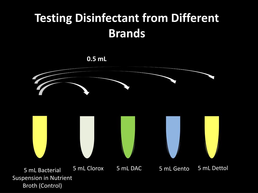 Testing Disinfectant from Different Brands 0.5 mL 5 mLDettol 5 mL Clorox 5 mL DAC 5 mLGento 5 mL Bacterial Suspension in Nutrient Broth (Control)