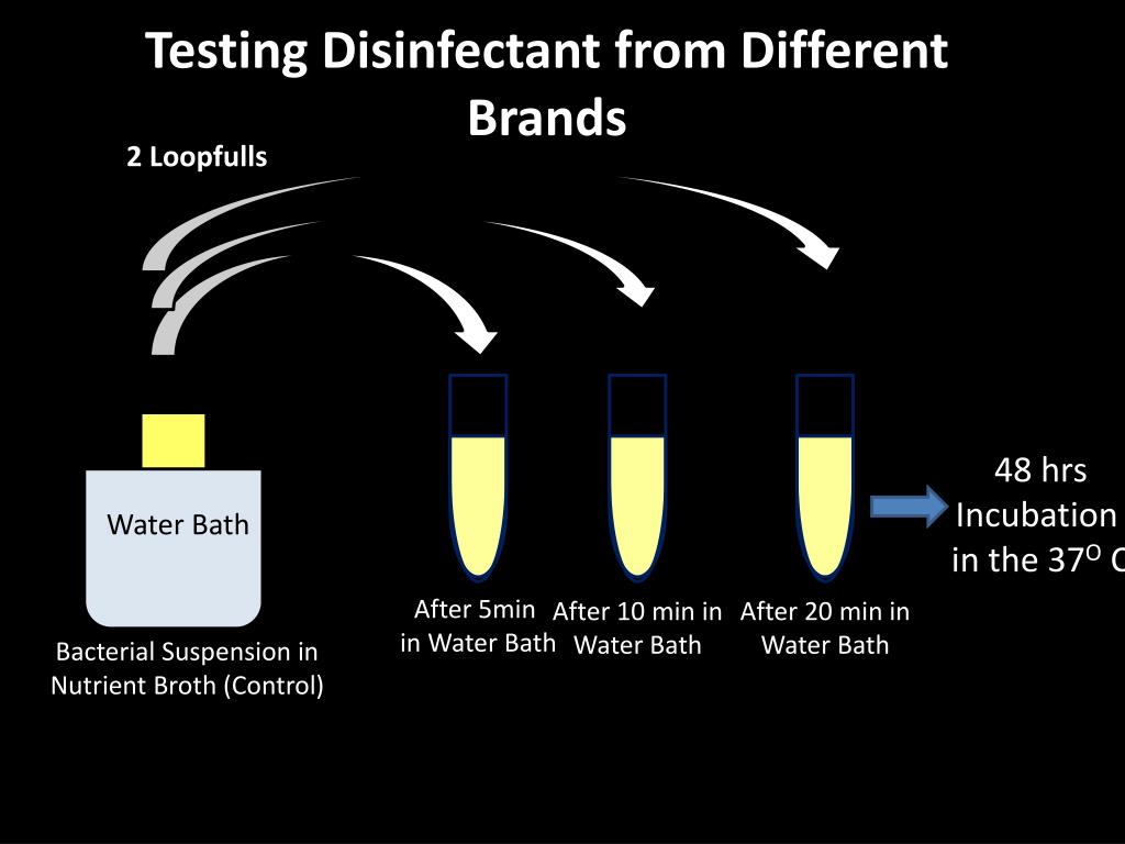 Testing Disinfectant from Different Brands 2 Loopfulls 48 hrs Incubation in the 37O C Water Bath After 5min in Water Bath After 10 min in Water Bath After 20 min in Water Bath Bacterial Suspension in Nutrient Broth (Control)