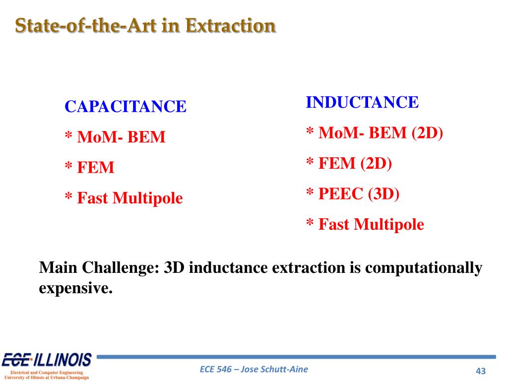 State-of-the-Art in Extraction INDUCTANCE * MoM- BEM (2D) * FEM (2D) * PEEC (3D) * Fast Multipole CAPACITANCE * MoM- BEM * FEM * Fast Multipole Main Challenge: 3D inductance extraction is computationally expensive.