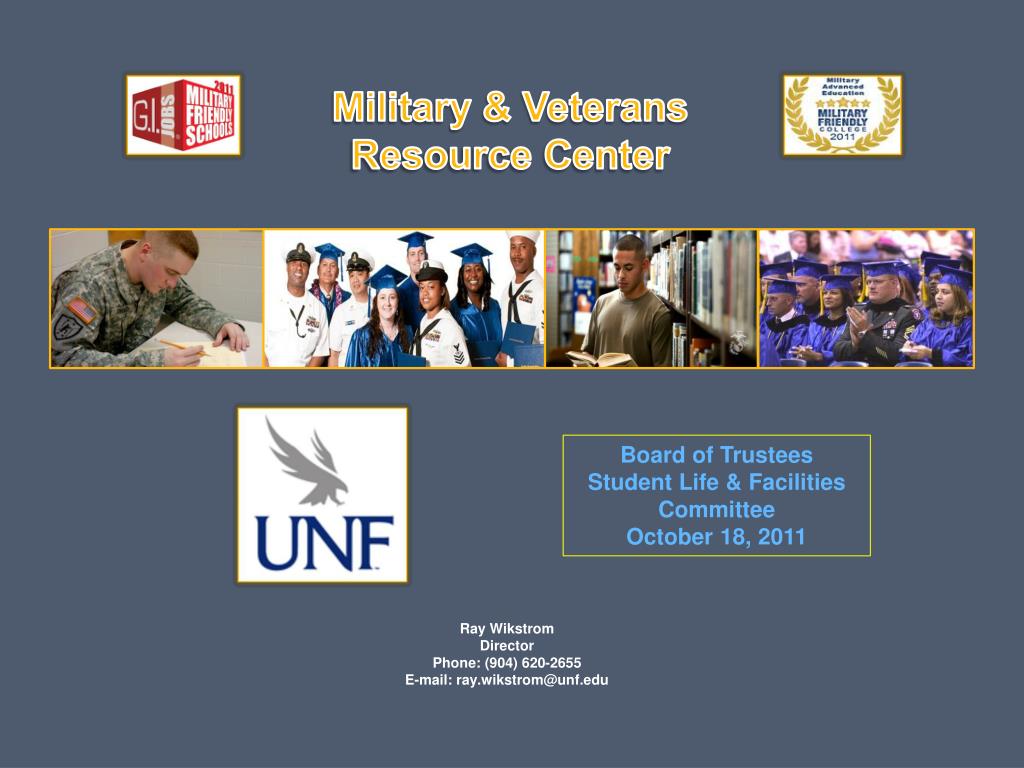 Military & Veterans Resource Center Board of Trustees Student Life & Facilities Committee October 18, 2011 Ray Wikstrom Director Phone: (904) 620-2655 E-mail: ray.wikstrom@unf.edu