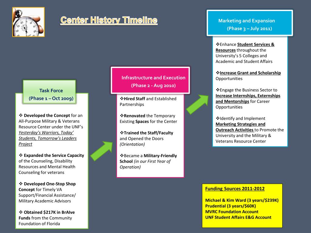 Military & Veterans Resource Center. Board of Trustees Student Life & Facilities Committee October 18, 2011. Ray Wikstrom Director Phone: (904) 620-2655 E-mail: ray.wikstrom@unf.edu. Marketing and Expansion (Phase 3 – July 2011). Center History Timeline.