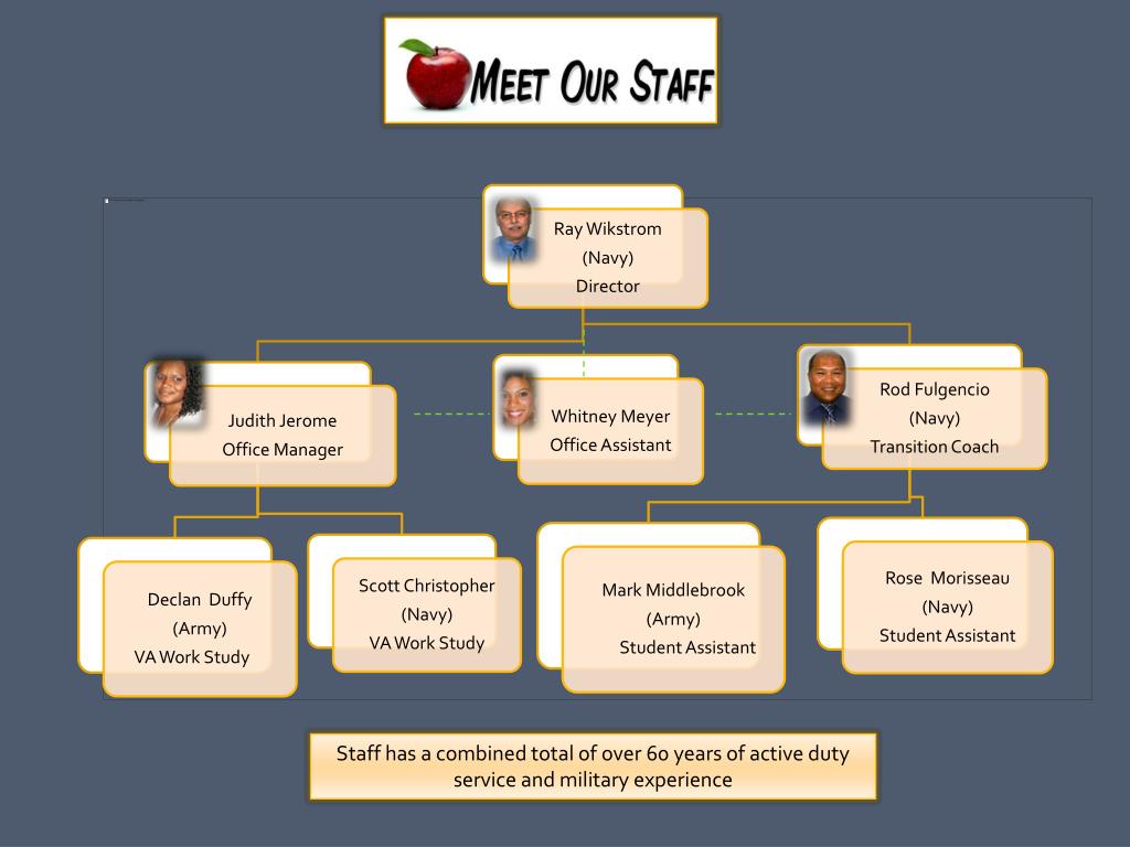 Staff has a combined total of over 60 years of active duty service and military experience