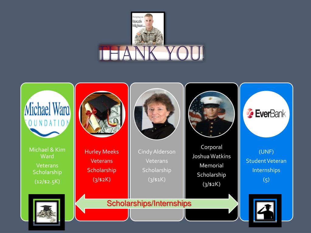 Marketing and Expansion (Phase 3 – July 2011) Center History Timeline • Enhance Student Services & Resources throughout the University’s 5 Colleges and Academic and Student Affairs • Increase Grant and Scholarship Opportunities • Engage the Business Sector to Increase Internships, Externships and Mentorships for Career Opportunities • Identify and Implement Marketing Strategies and Outreach Activities to Promote the University and the Military & Veterans Resource Center Infrastructure and Execution (Phase 2 - Aug 2010) • Hired Staff and Established Partnerships • Renovated theTemporary Existing Spaces for the Center • Trained the Staff/Faculty and Opened the Doors (Orientation) • Became a Military-Friendly School (in our First Year of Operation) • Developed the Concept for an All-Purpose Military & Veterans Resource Center under the UNF’s Yesterday’s Warriors, Today’ Students, Tomorrow’s Leaders Project • Expanded the Service Capacity of the Counseling, Disability Resources and Mental Health Counseling for veterans • Developed One-Stop Shop Concept for Timely VA Support/Financial Assistance/ Military Academic Advisors • Obtained $217K in BrAIve Funds from the Community Foundation of Florida Task Force (Phase 1 – Oct 2009) FundingSources 2011-2012 Michael & Kim Ward (3 years/$239K) Prudential (3 years/$60K) MVRC Foundation Account UNF Student Affairs E&G Account