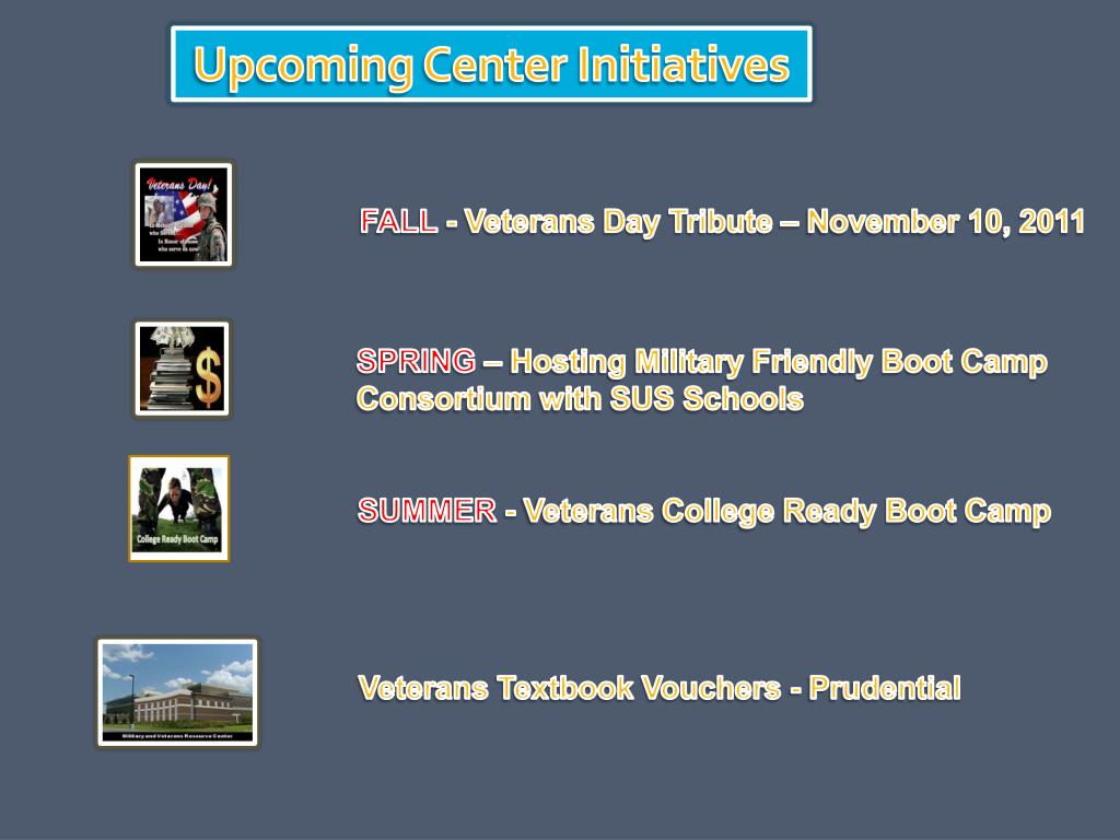 Upcoming Center Initiatives FALL - Veterans Day Tribute – November 10, 2011 SPRING – Hosting Military Friendly Boot Camp Consortium with SUS Schools SUMMER - Veterans College Ready Boot Camp Veterans Textbook Vouchers - Prudential