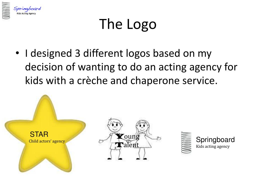The Logo • I designed 3 different logos based on my decision of wanting to do an acting agency for kids with a crèche and chaperone service. STAR Child actors’ agency Young Talent Springboard Kids acting agency