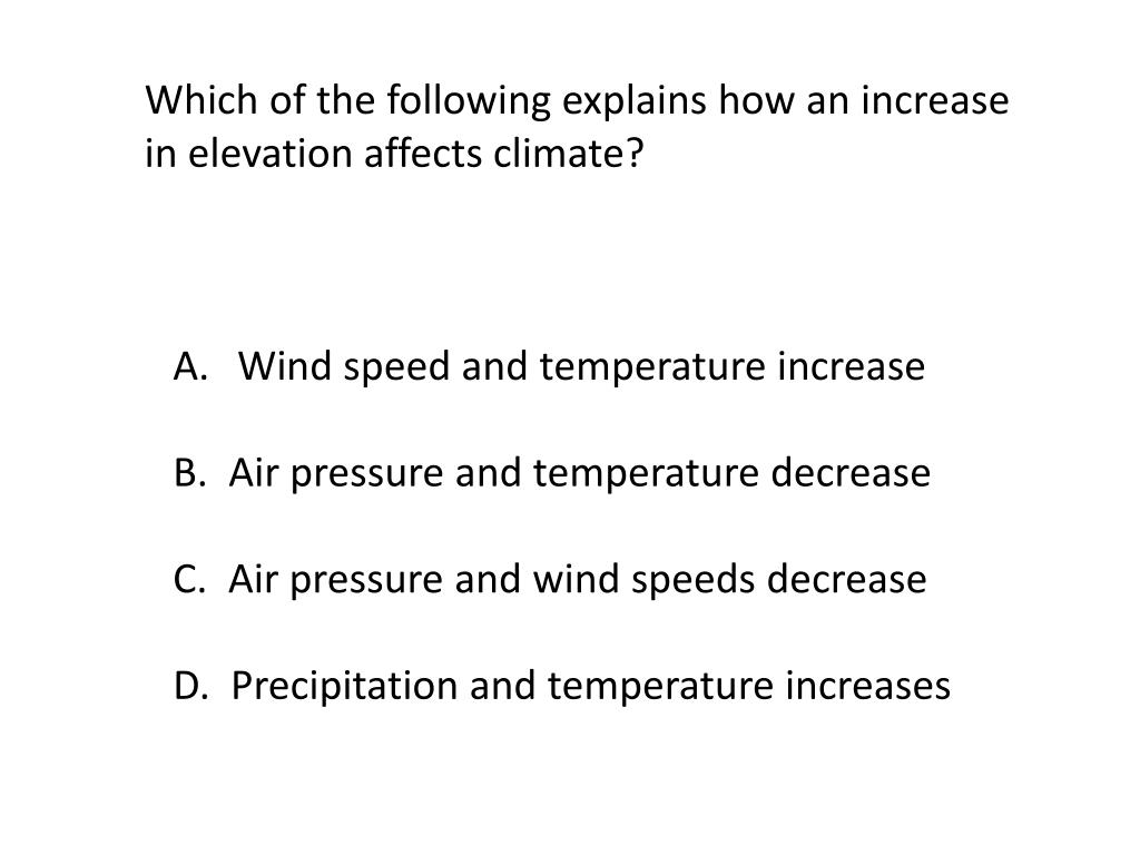 Which of the following explains how an increase in elevation affects climate? Wind speed and temperature increase B. Air pressure and temperature decrease C. Air pressure and wind speeds decrease D. Precipitation and temperature increases