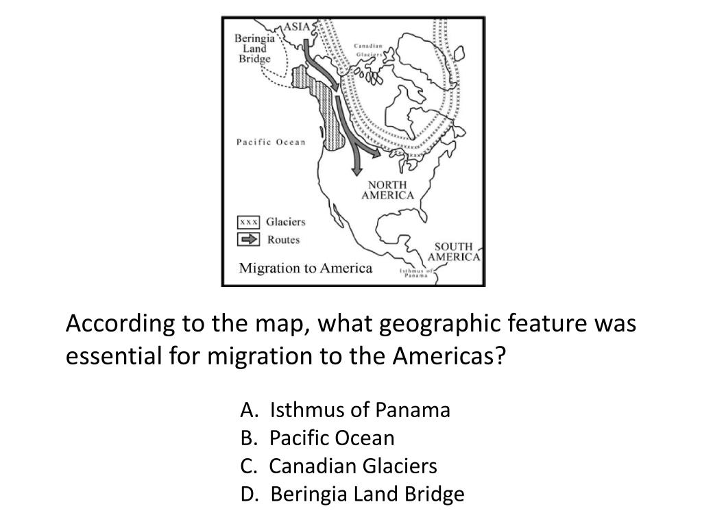 According to the map, what geographic feature was essential for migration to the Americas? A. Isthmus of Panama B. Pacific Ocean C. Canadian Glaciers D. Beringia Land Bridge