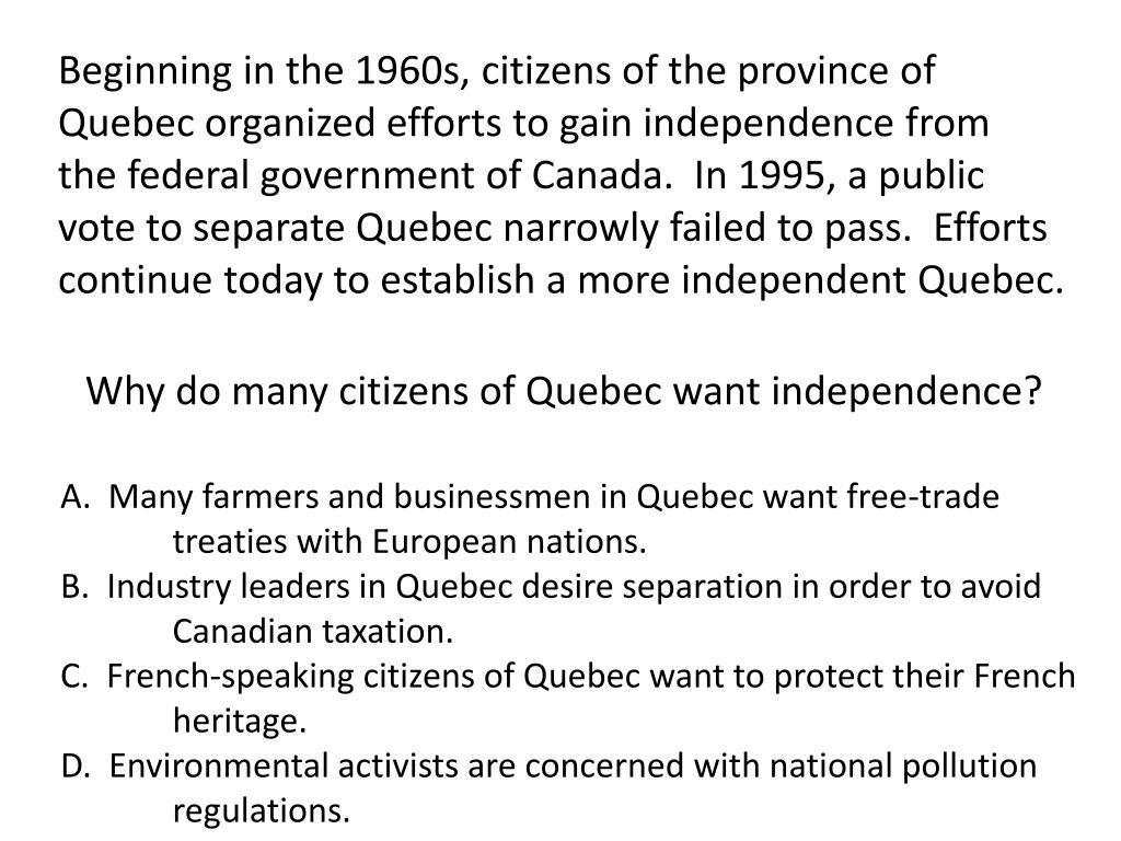 Beginning in the 1960s, citizens of the province of Quebec organized efforts to gain independence from the federal government of Canada. In 1995, a public vote to separate Quebec narrowly failed to pass. Efforts continue today to establish a more independent Quebec. Why do many citizens of Quebec want independence? A. Many farmers and businessmen in Quebec want free-trade treaties with European nations. B. Industry leaders in Quebec desire separation in order to avoid Canadian taxation. C. French-speaking citizens of Quebec want to protect their French heritage. D. Environmental activists are concerned with national pollution regulations.