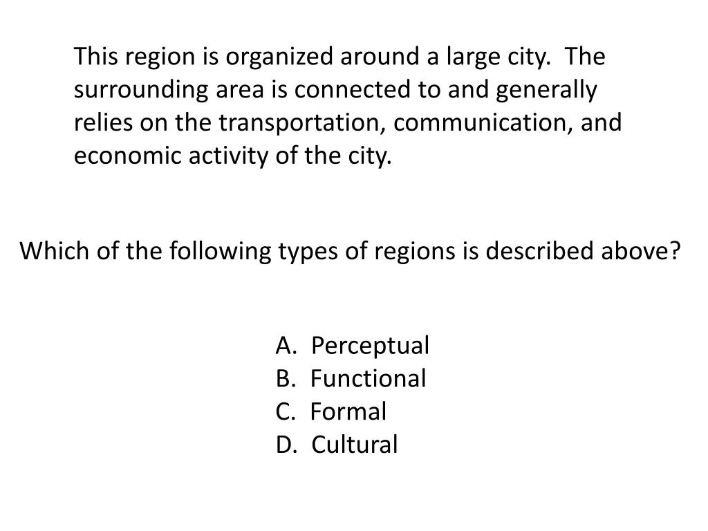 This region is organized around a large city. The surrounding area is connected to and generally relies on the transportation, communication, and economic activity of the city. Which of the following types of regions is described above? A. Perceptual B. Functional C. Formal D. Cultural