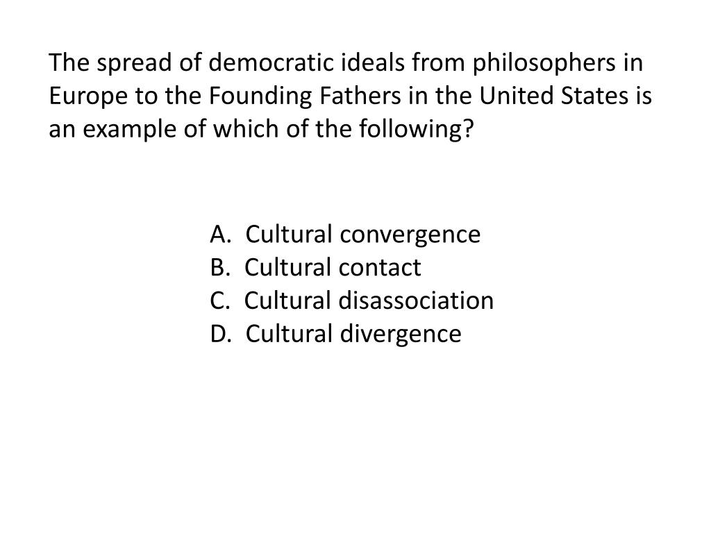 The spread of democratic ideals from philosophers in Europe to the Founding Fathers in the United States is an example of which of the following? A. Cultural convergence B. Cultural contact C. Cultural disassociation D. Cultural divergence