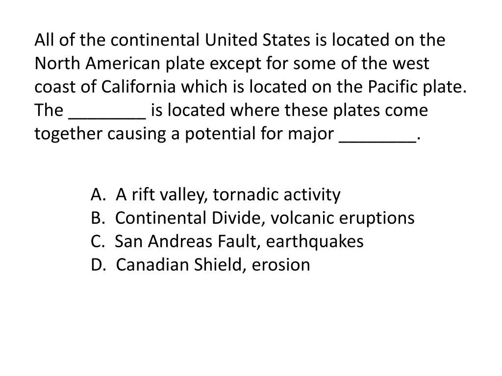 All of the continental United States is located on the North American plate except for some of the west coast of California which is located on the Pacific plate. The ________ is located where these plates come together causing a potential for major ________. A. A rift valley, tornadic activity B. Continental Divide, volcanic eruptions C. San Andreas Fault, earthquakes D. Canadian Shield, erosion