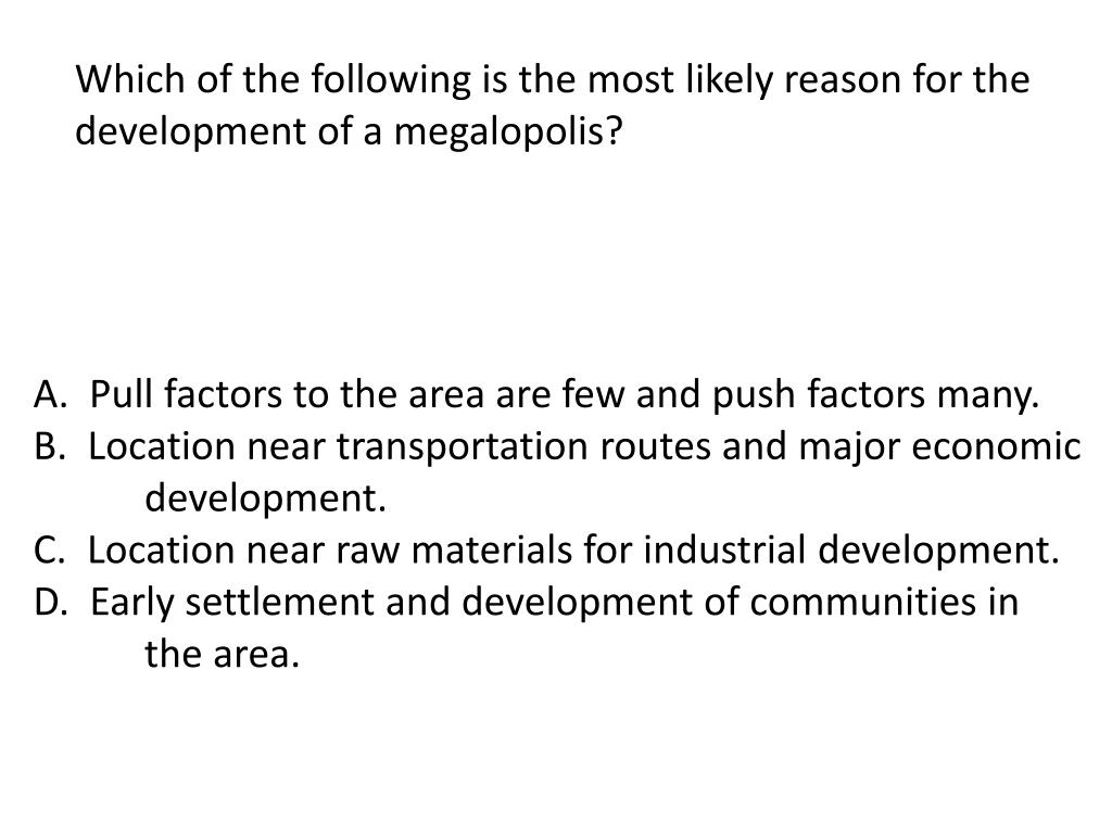 Which of the following is the most likely reason for the development of a megalopolis? A. Pull factors to the area are few and push factors many. B. Location near transportation routes and major economic development. C. Location near raw materials for industrial development. D. Early settlement and development of communities in the area.