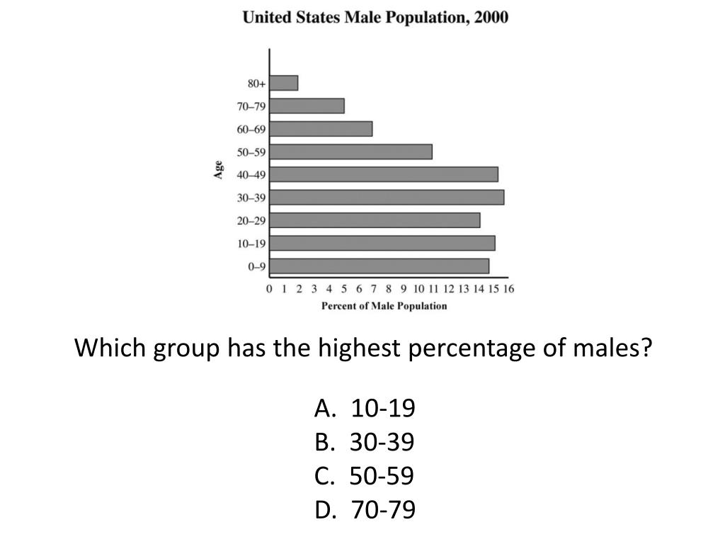 Which group has the highest percentage of males? A. 10-19 B. 30-39 C. 50-59 D. 70-79