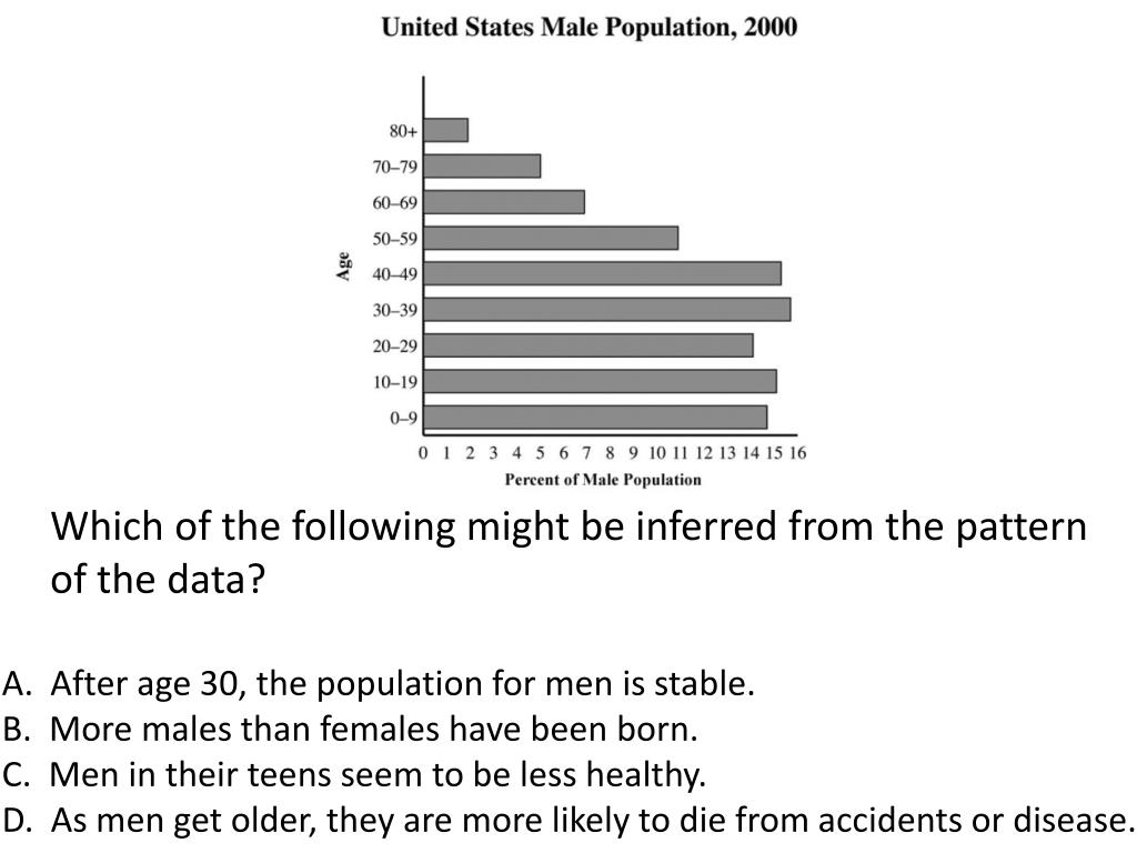 Which of the following might be inferred from the pattern of the data? A. After age 30, the population for men is stable. B. More males than females have been born. C. Men in their teens seem to be less healthy. D. As men get older, they are more likely to die from accidents or disease.