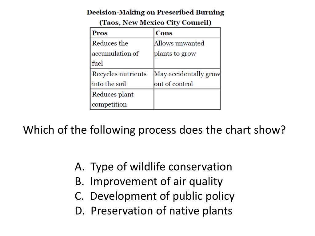 Which of the following process does the chart show? A. Type of wildlife conservation B. Improvement of air quality C. Development of public policy D. Preservation of native plants